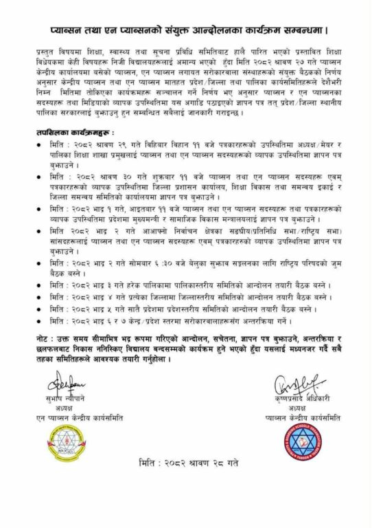 भदौ ३ गते पालिका, ४ गते जिल्ला, ५ गते प्रदेशस्तरीय आन्दोलन तयारी बैठक गर्ने र भदौ ६९७ गते केन्द्र र प्रदेशस्तरमा सरोकारवालासँग अन्तरक्रिया कार्यक्रम गर्ने घोषणा उनीहरूको छ ।