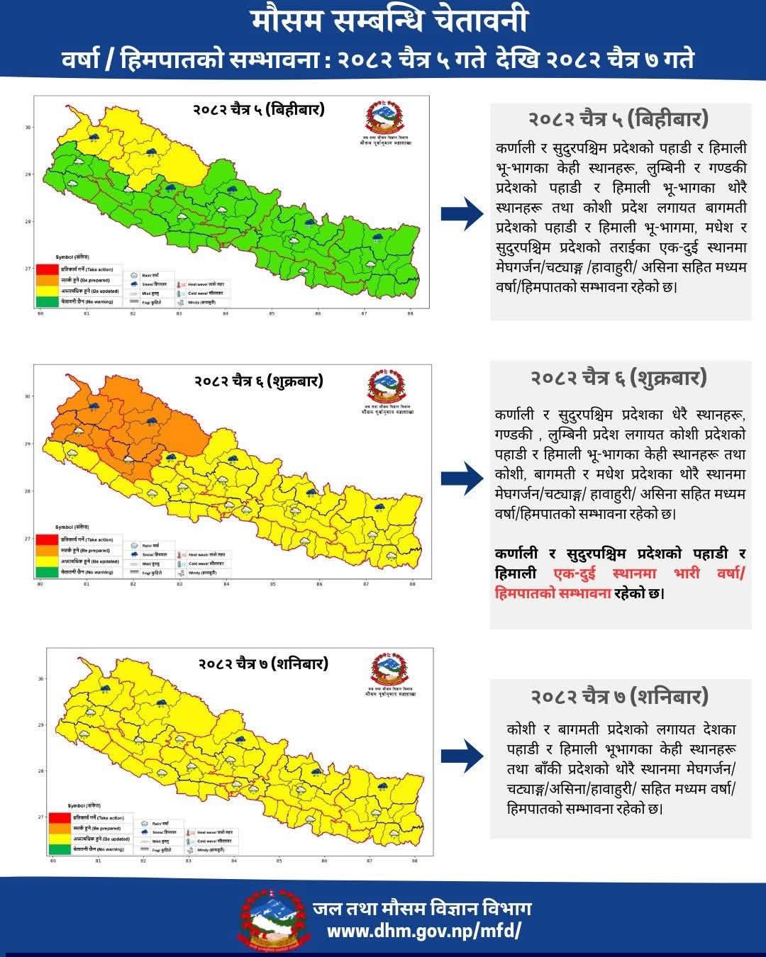 विभाग मौसमसम्बन्धी नियमित पूर्वानुमान र सतर्कता जारी गर्दै आएको छ र सबैमा आवश्यक सावधानी अपनाउन अनुरोध गरेको छ ।