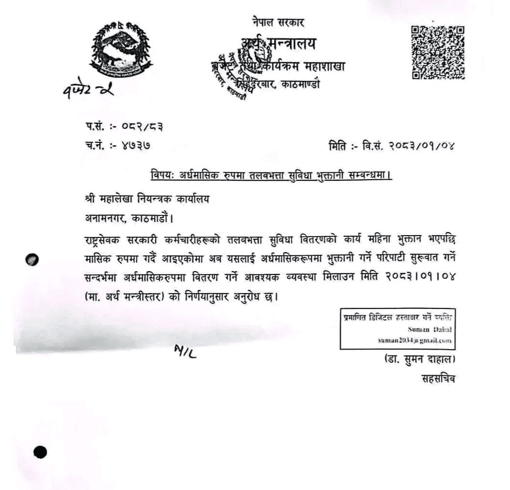 सरकारले अबदेखि सरकारी कर्मचारीहरूलाई अर्धमासिक रुपमा तलबभत्ता उपलब्ध गराउने भएको छ ।