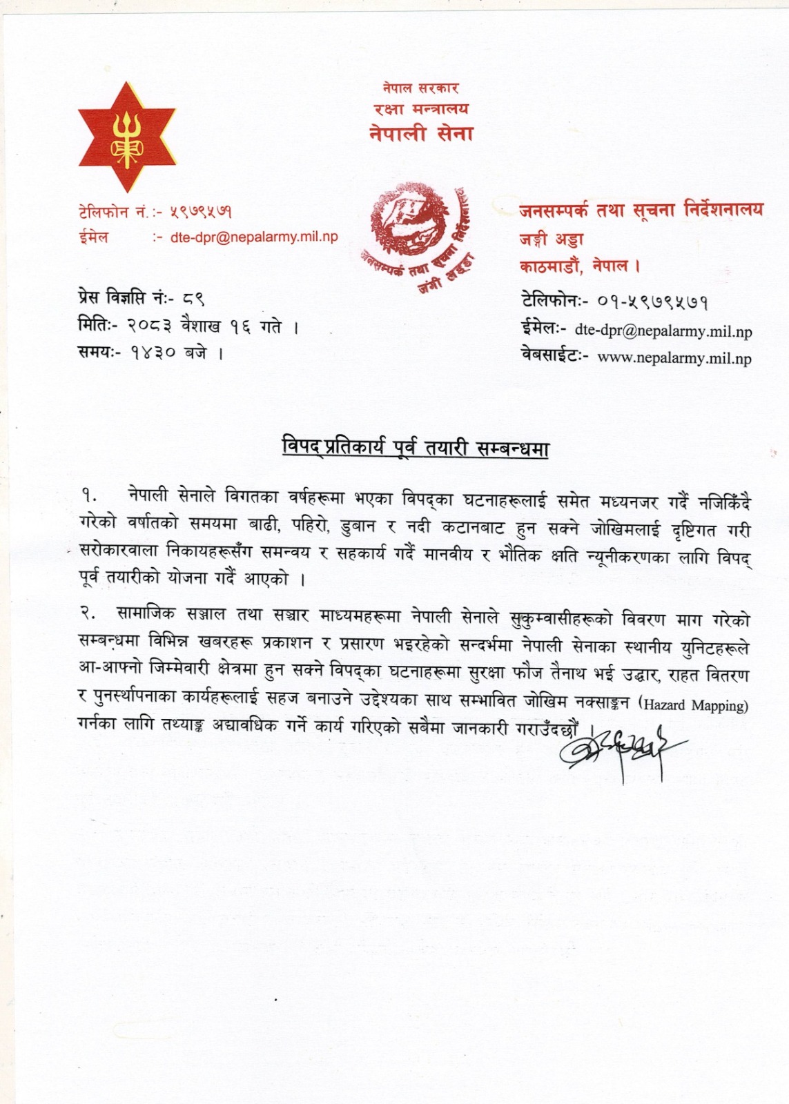 सञ्चार माध्यममा नेपाली सेनाले सूचना माग गरेको विषयमा विभिन्न समाचार प्रकाशन तथा प्रसारण भएको सन्दर्भमा सेनाले स्थानीय युनिटहरूले आ–आफ्नो जिम्मेवारी क्षेत्रमा हुन सक्ने विपद्का घटनामा सुरक्षा फौज तैनाथ भई उद्धार, राहत वितरण तथा पुनर्स्थापनाका कार्यलाई सहज बनाउने उद्देश्यले तथ्याङ्क संकलन गरेको स्पष्ट पारेको छ ।