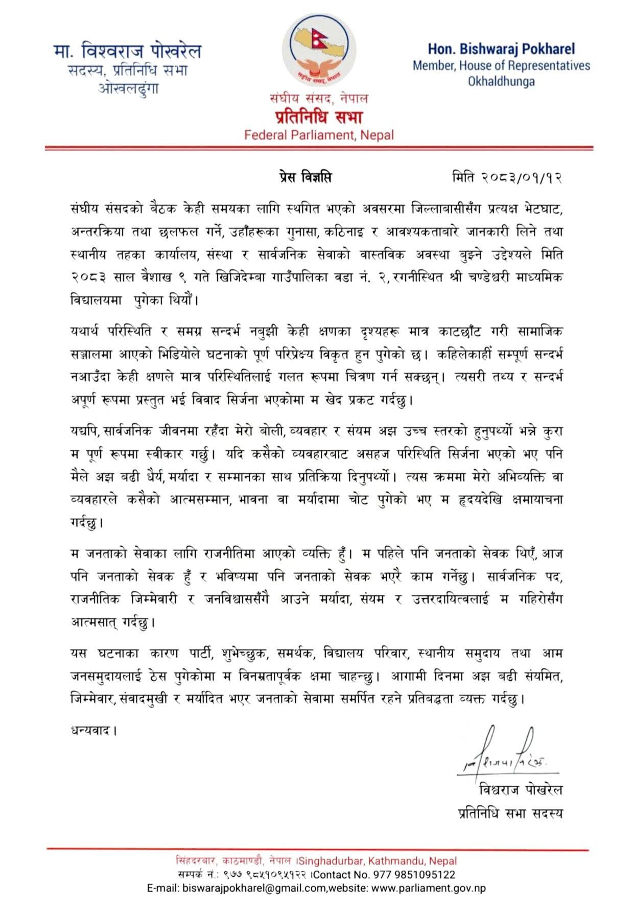 प्रतिनिधिसभा सदस्य विश्वराज पोखरेलले सामाजिक सञ्जालमा सार्वजनिक भएको एक विवादास्पद भिडियोप्रति क्षमायाचना गरेका छन् ।